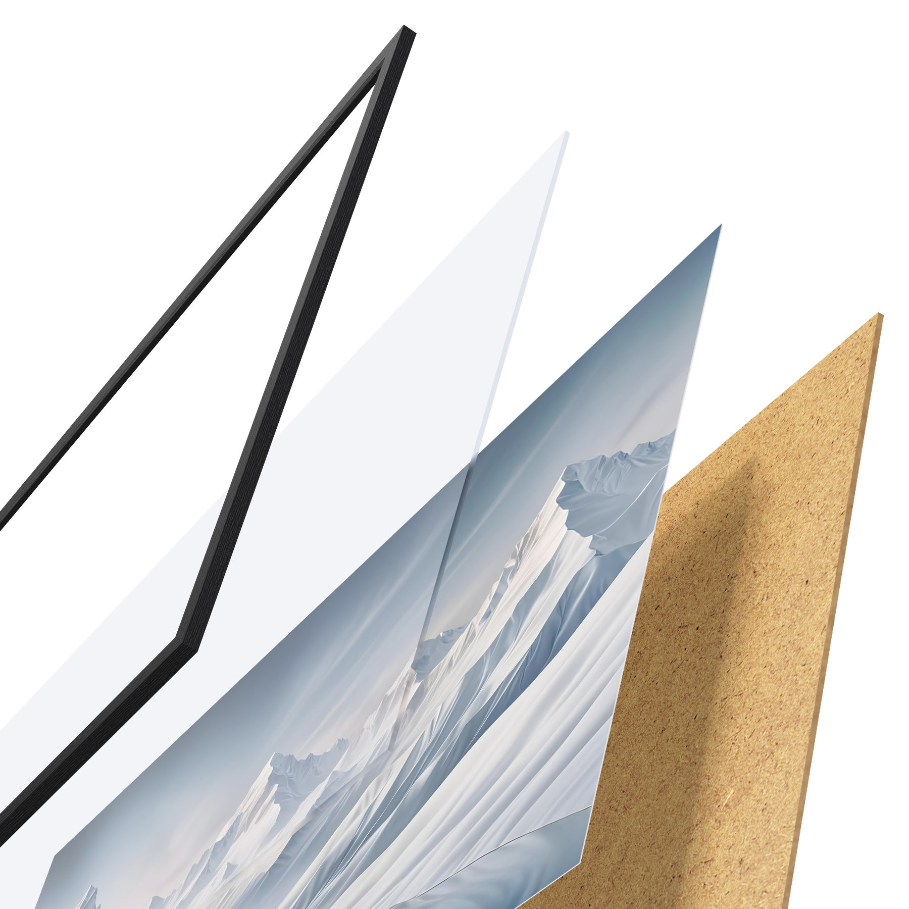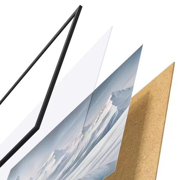 Das Poster besteht aus einem Rahmen, Plexiglas, einem gedruckten Bild und einer Rückwand aus Spanplatten. Dank der Halterungen auf der Rückseite kann das Poster sofort an die Wand gehängt werden.