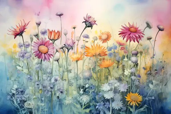 Poster Ein lebhaftes Feld hoher und üppiger Wildblumen vor einem weichen, pastellfarbenen, aquarellartigen Hintergrund Nr f42726