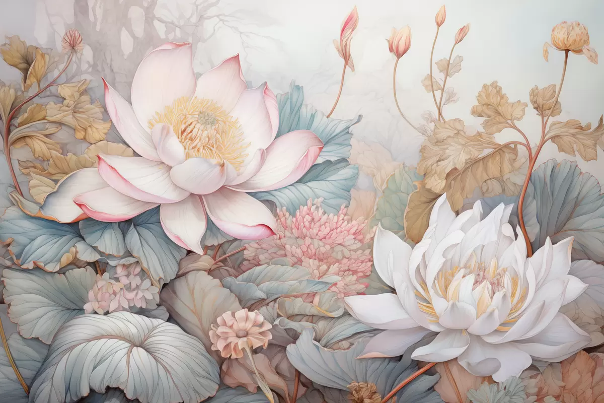 Poster Große, blühende Lotosblüten in zarten Rosa- und Weißtönen, umgeben von grünen Blättern und zartrosa Laub Nr f42729