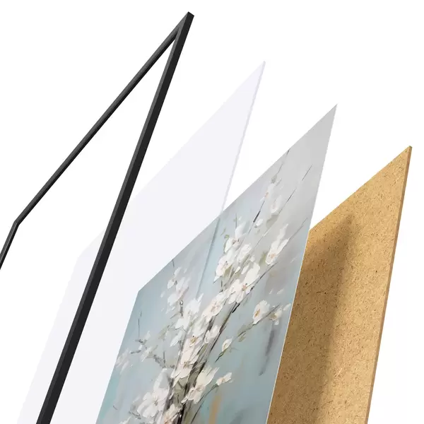 Das Poster besteht aus einem Rahmen, Plexiglas, einem gedruckten Bild und einer Rückwand aus Spanplatten. Dank der Halterungen auf der Rückseite kann das Poster sofort an die Wand gehängt werden.