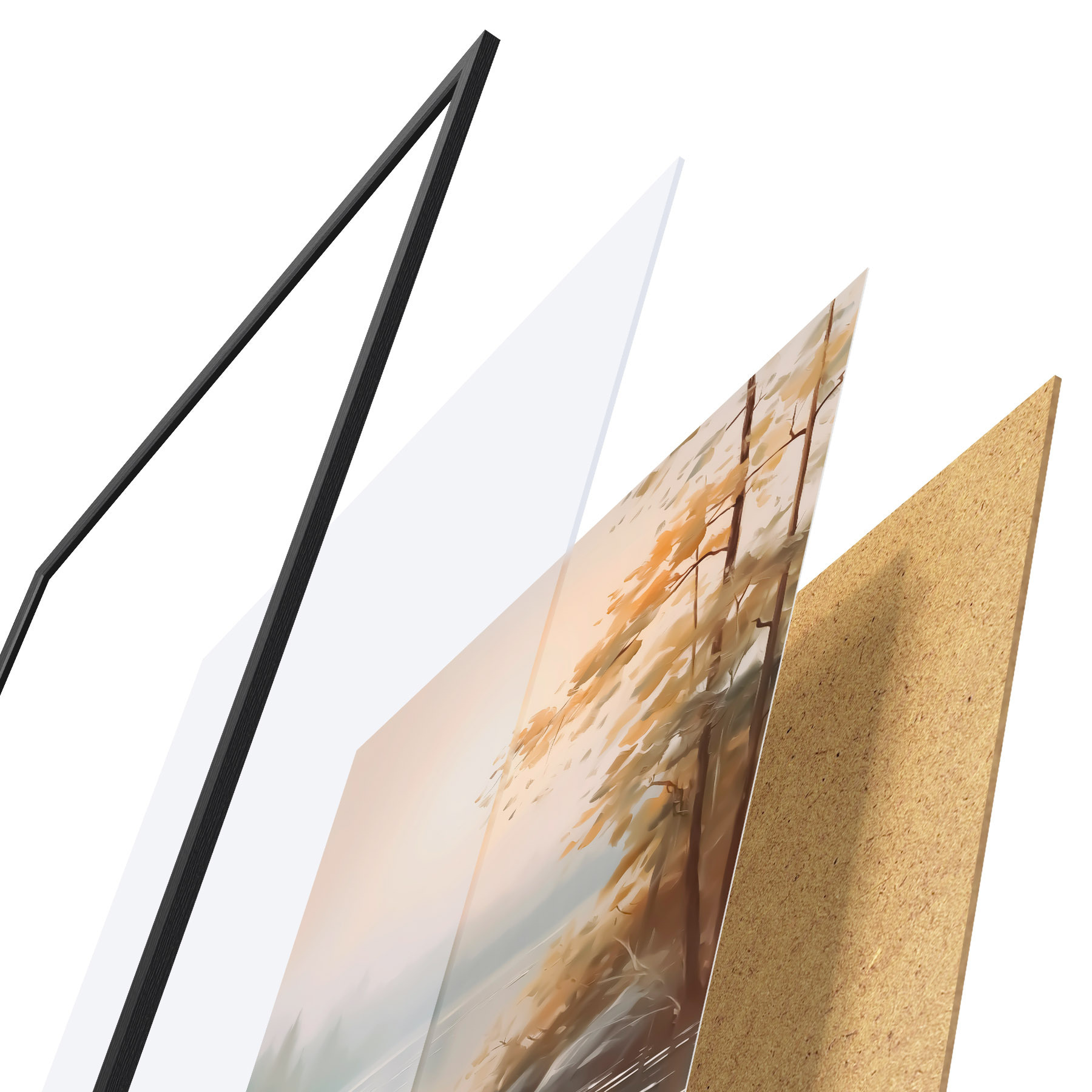 Das Poster besteht aus einem Rahmen, Plexiglas, einem gedruckten Bild und einer Rückwand aus Spanplatten. Dank der Halterungen auf der Rückseite kann das Poster sofort an die Wand gehängt werden.