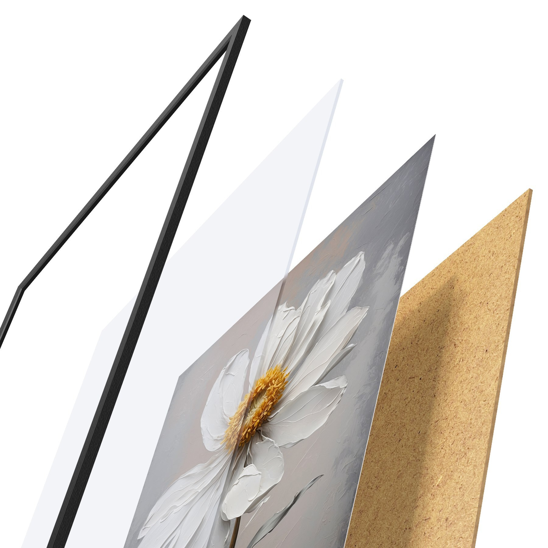 Das Poster besteht aus einem Rahmen, Plexiglas, einem gedruckten Bild und einer Rückwand aus Spanplatten. Dank der Halterungen auf der Rückseite kann das Poster sofort an die Wand gehängt werden.