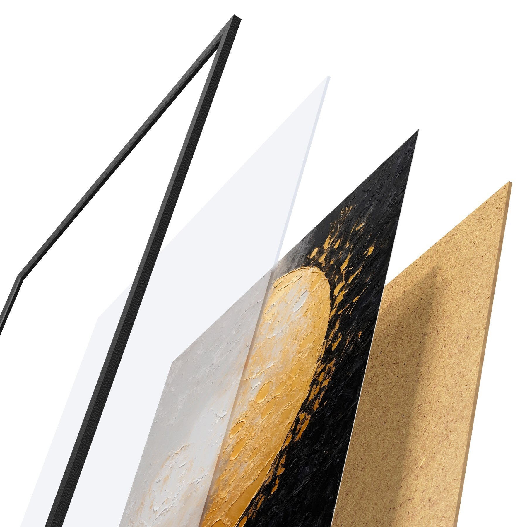 Das Poster besteht aus einem Rahmen, Plexiglas, einem gedruckten Bild und einer Rückwand aus Spanplatten. Dank der Halterungen auf der Rückseite kann das Poster sofort an die Wand gehängt werden.
