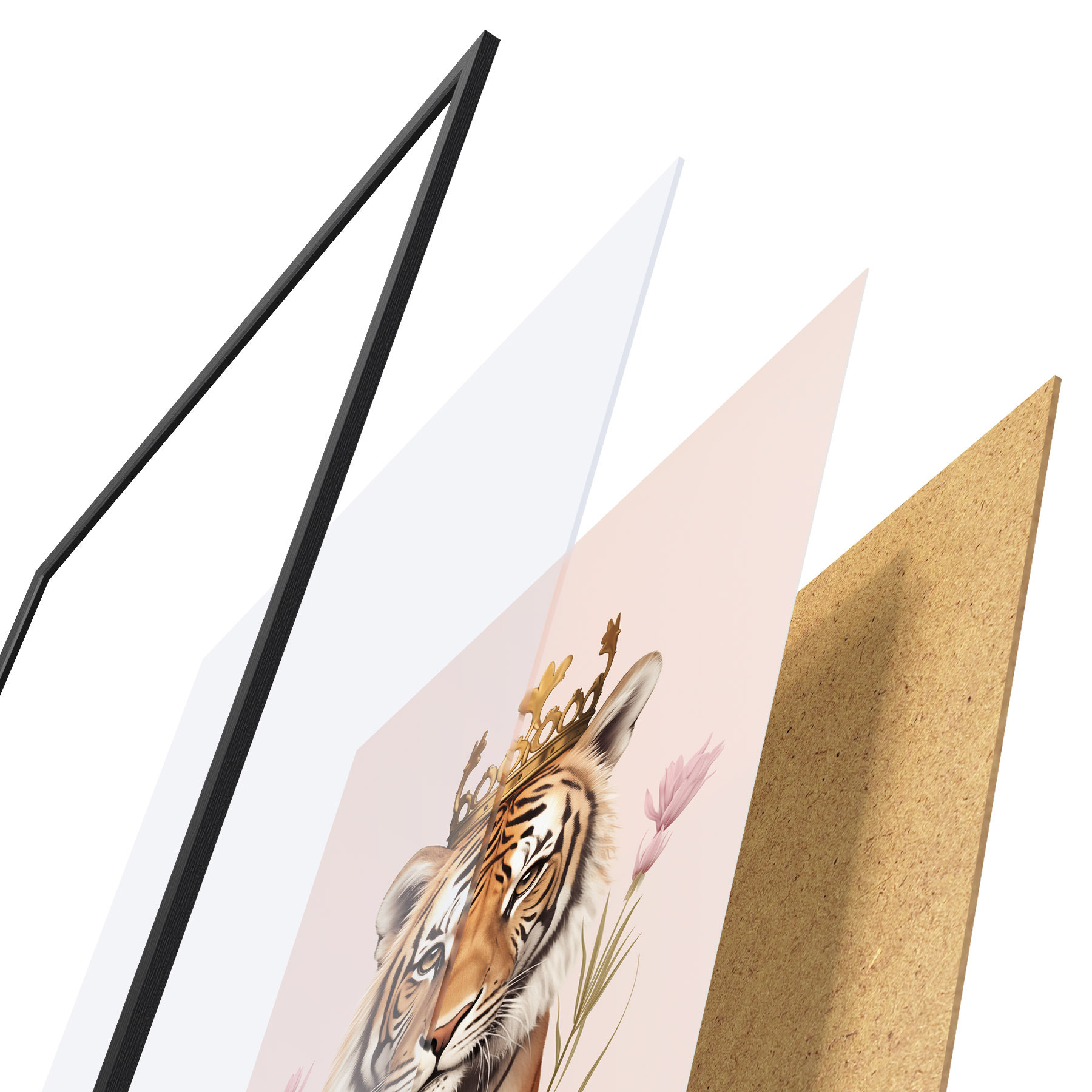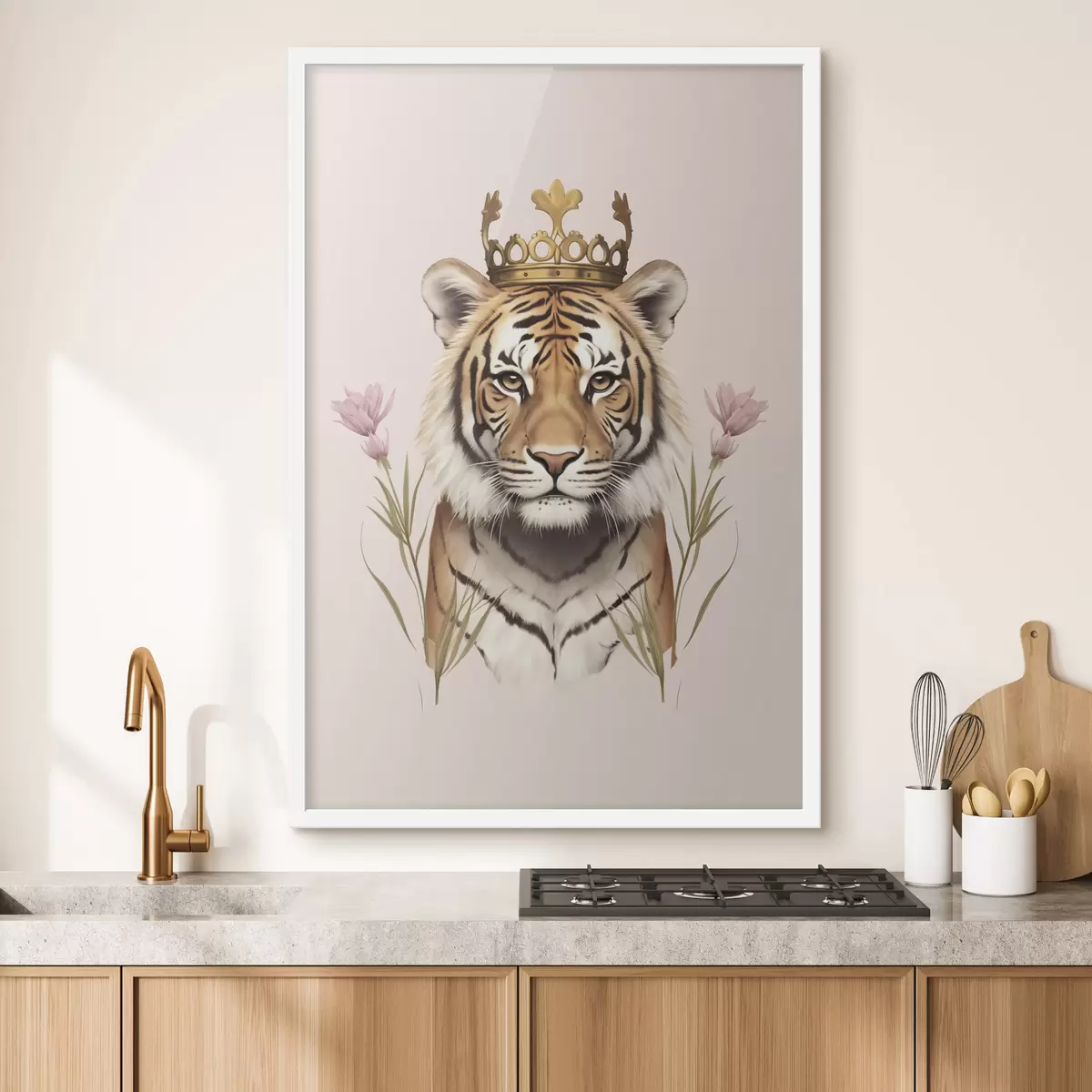 Poster Tiger mit Krone, rosa Hintergrund, Tulpenblüten Nr f42782