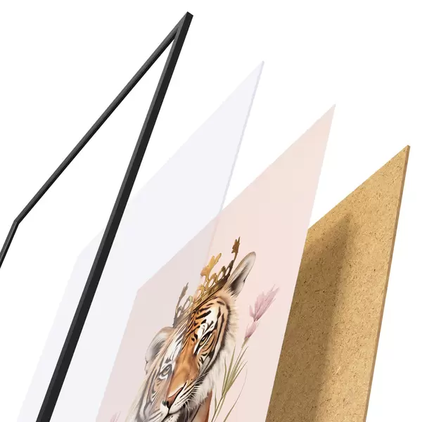 Das Poster besteht aus einem Rahmen, Plexiglas, einem gedruckten Bild und einer Rückwand aus Spanplatten. Dank der Halterungen auf der Rückseite kann das Poster sofort an die Wand gehängt werden.
