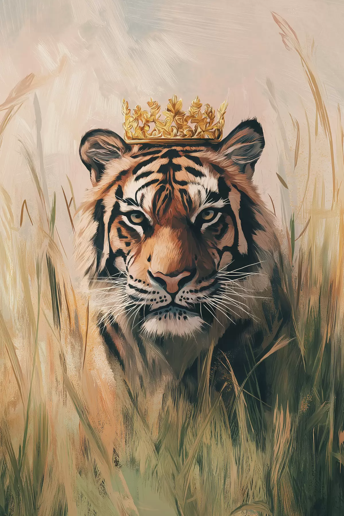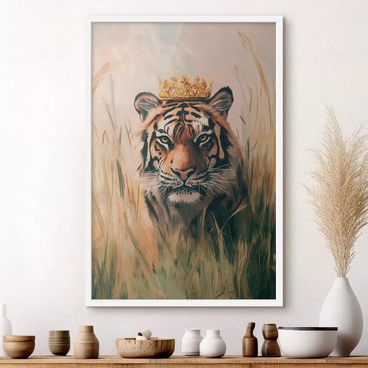 Poster Tiger auf einer Wiese mit Gras, Krone, Acrylzeichnung f42783