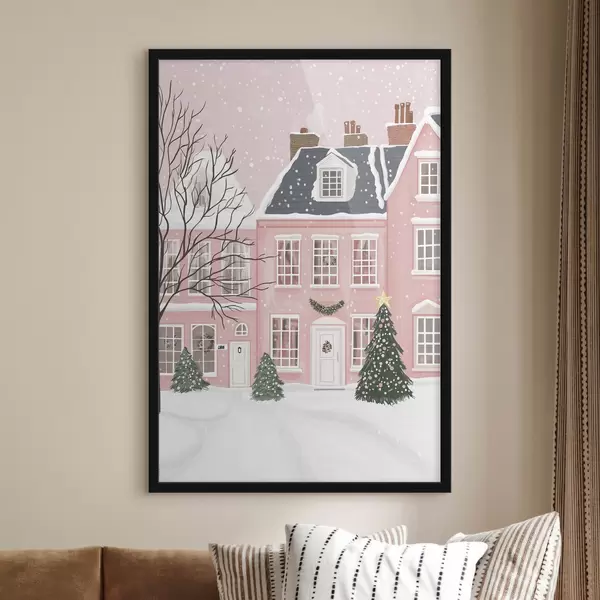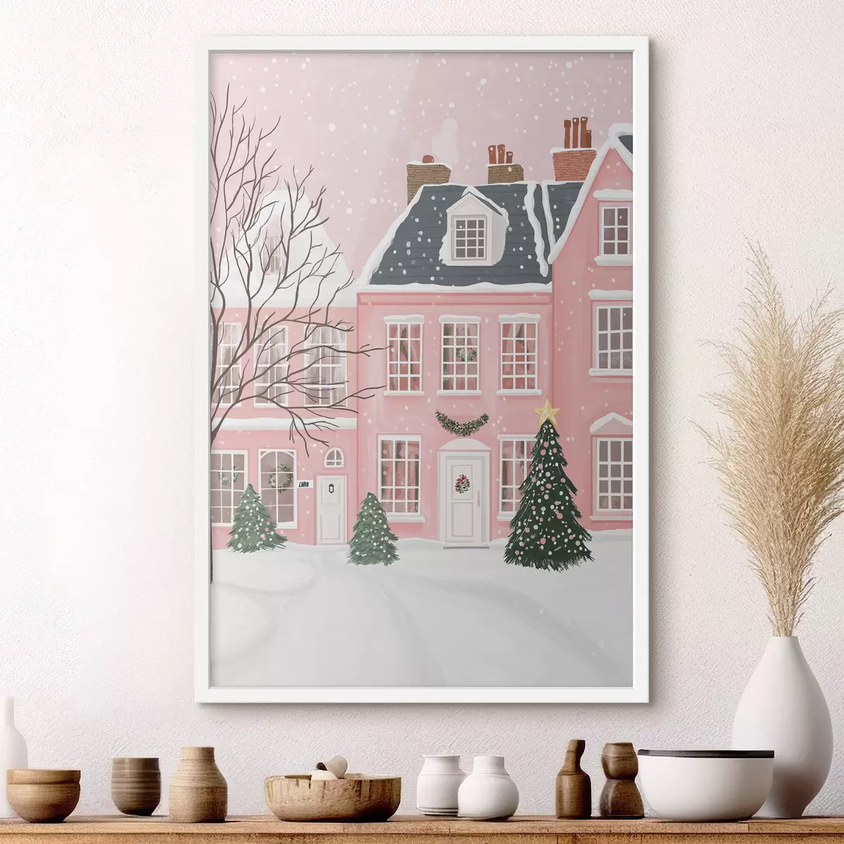 Poster Hübsche rosa Häuser, Kiefern, Winterlandschaften Nr f42791