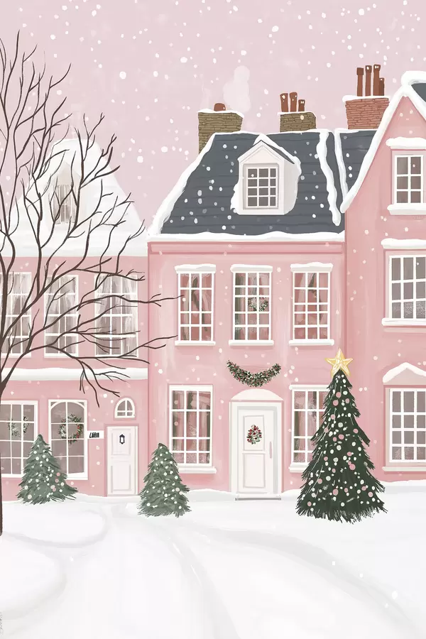 Poster Hübsche rosa Häuser, Kiefern, Winterlandschaften Nr f42791