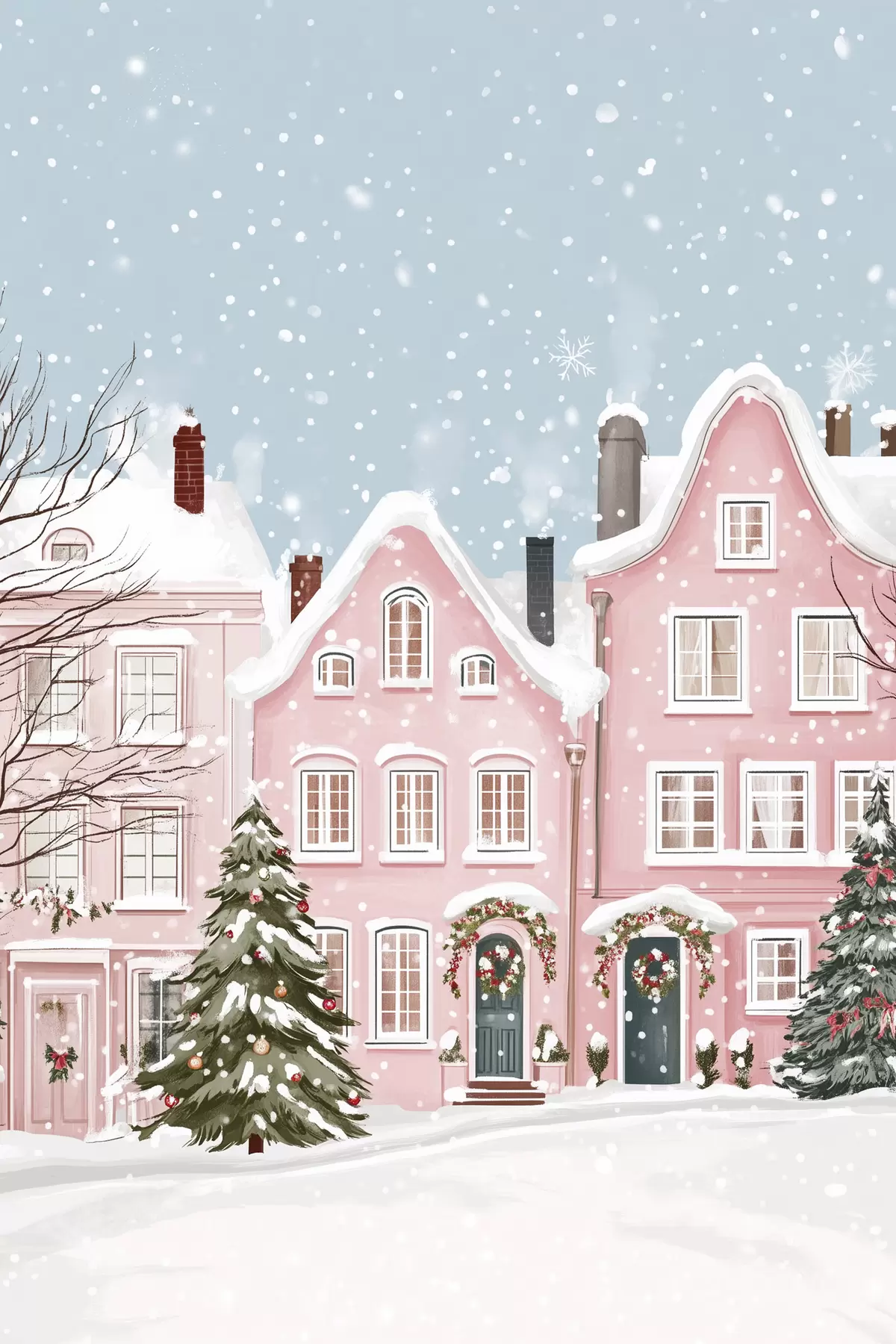 Poster Schöne Stadt mit niedlichen rosa Häusern, Winterästhetik, Schneeflocken Nr f42793