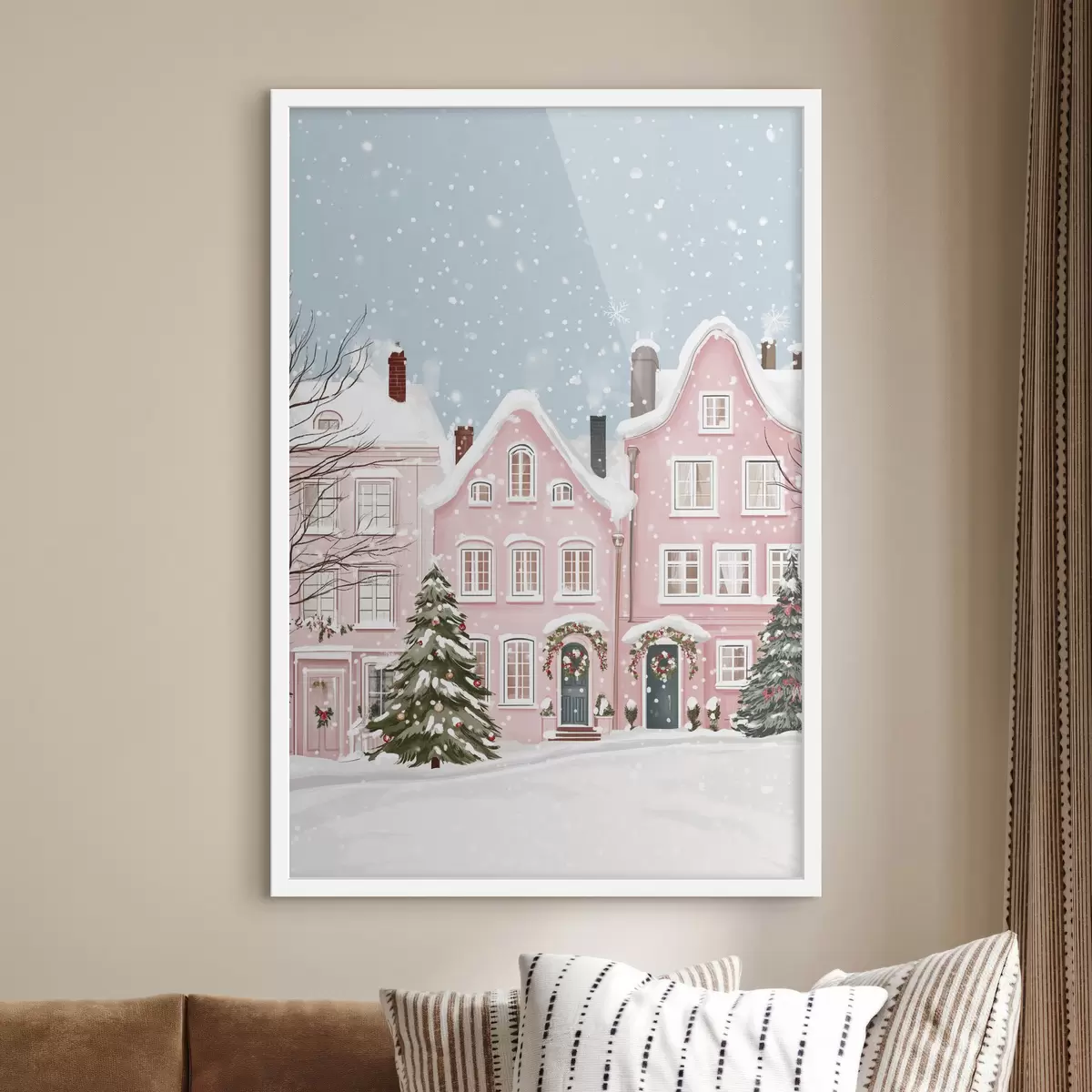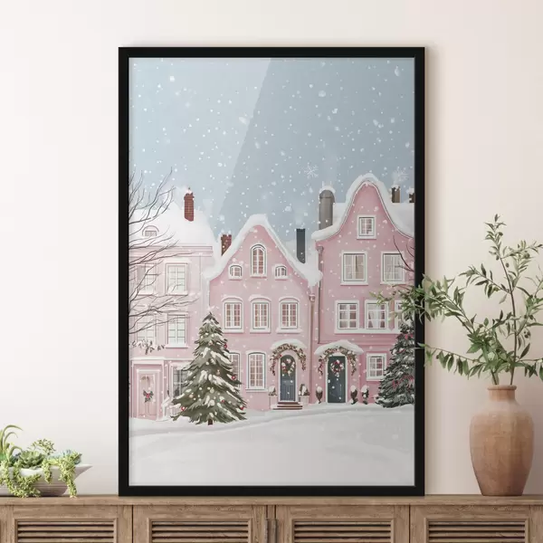 Poster Schöne Stadt mit niedlichen rosa Häusern, Winterästhetik, Schneeflocken f42793