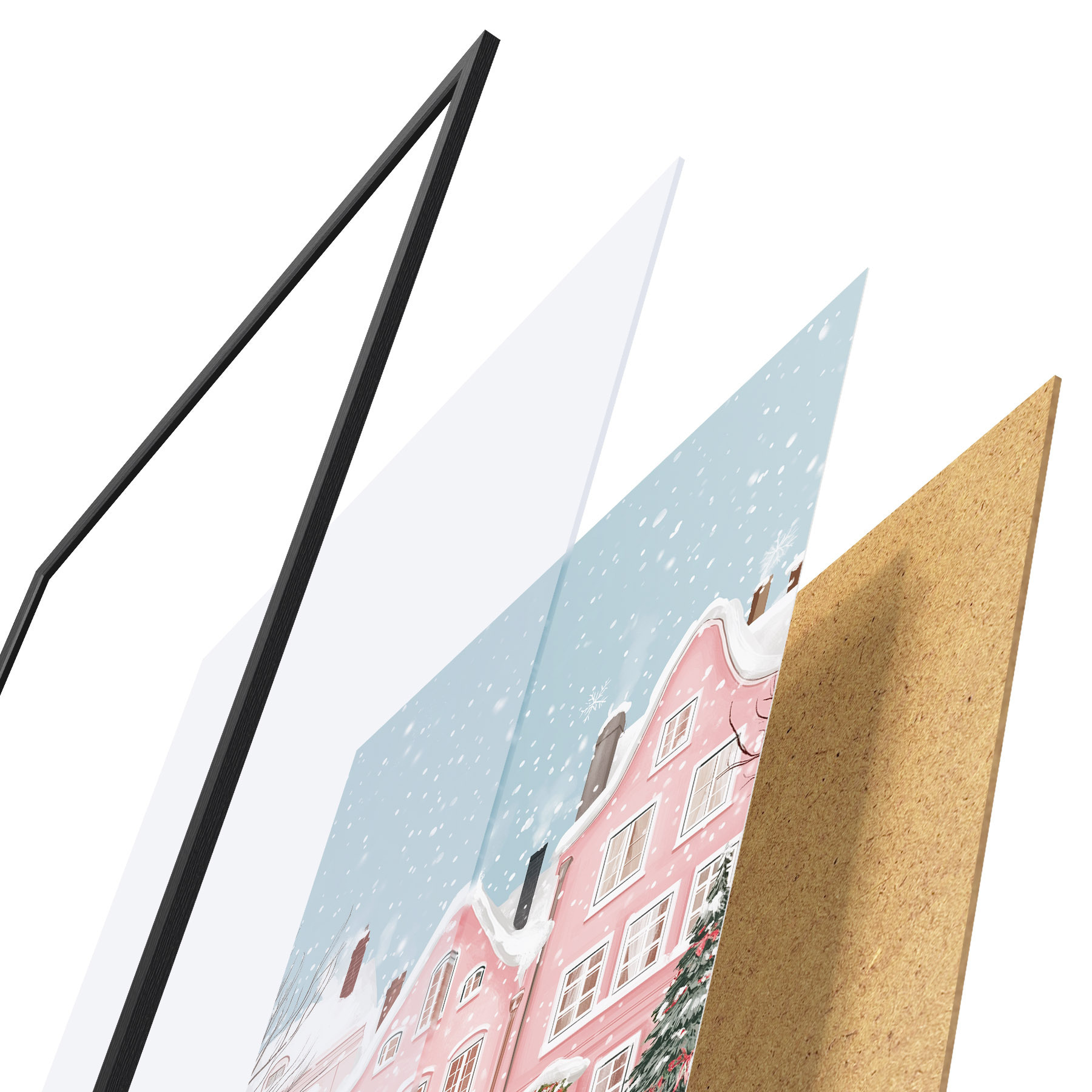 Das Poster besteht aus einem Rahmen, Plexiglas, einem gedruckten Bild und einer Rückwand aus Spanplatten. Dank der Halterungen auf der Rückseite kann das Poster sofort an die Wand gehängt werden.