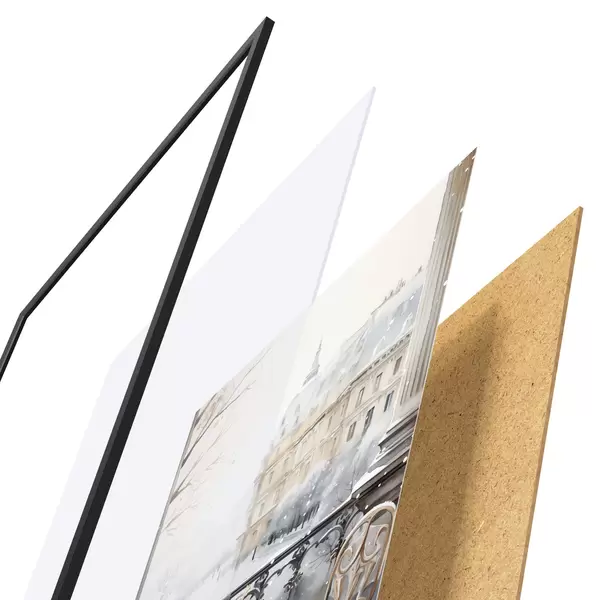 Das Poster besteht aus einem Rahmen, Plexiglas, einem gedruckten Bild und einer Rückwand aus Spanplatten. Dank der Halterungen auf der Rückseite kann das Poster sofort an die Wand gehängt werden.