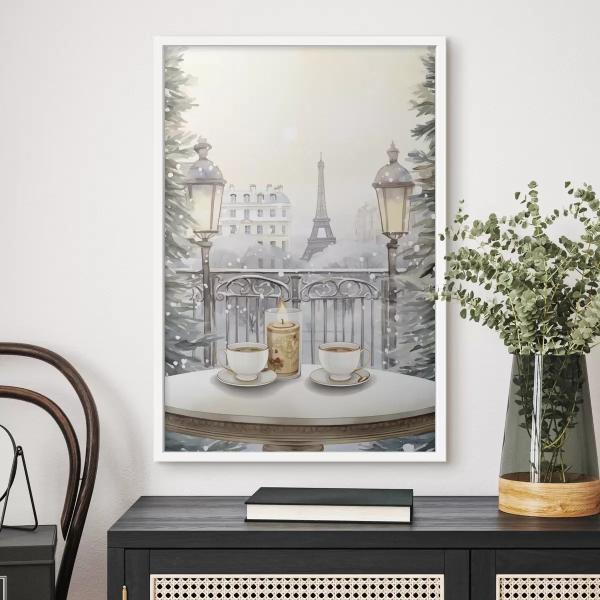 Poster Schönes Café in Paris, Teetassen, romantische Aussicht, Winter, Aquarellstil Nr f42799