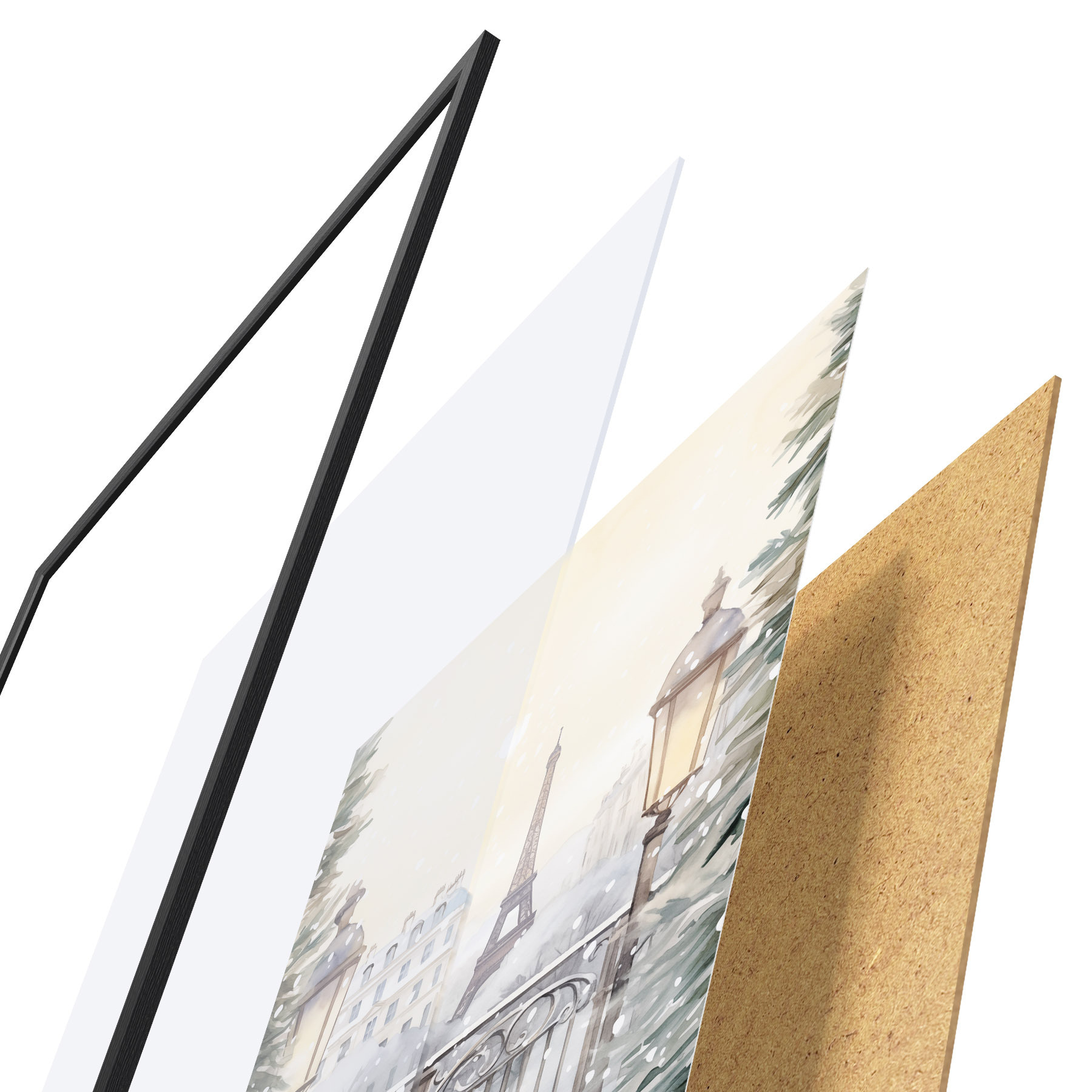 Das Poster besteht aus einem Rahmen, Plexiglas, einem gedruckten Bild und einer Rückwand aus Spanplatten. Dank der Halterungen auf der Rückseite kann das Poster sofort an die Wand gehängt werden.