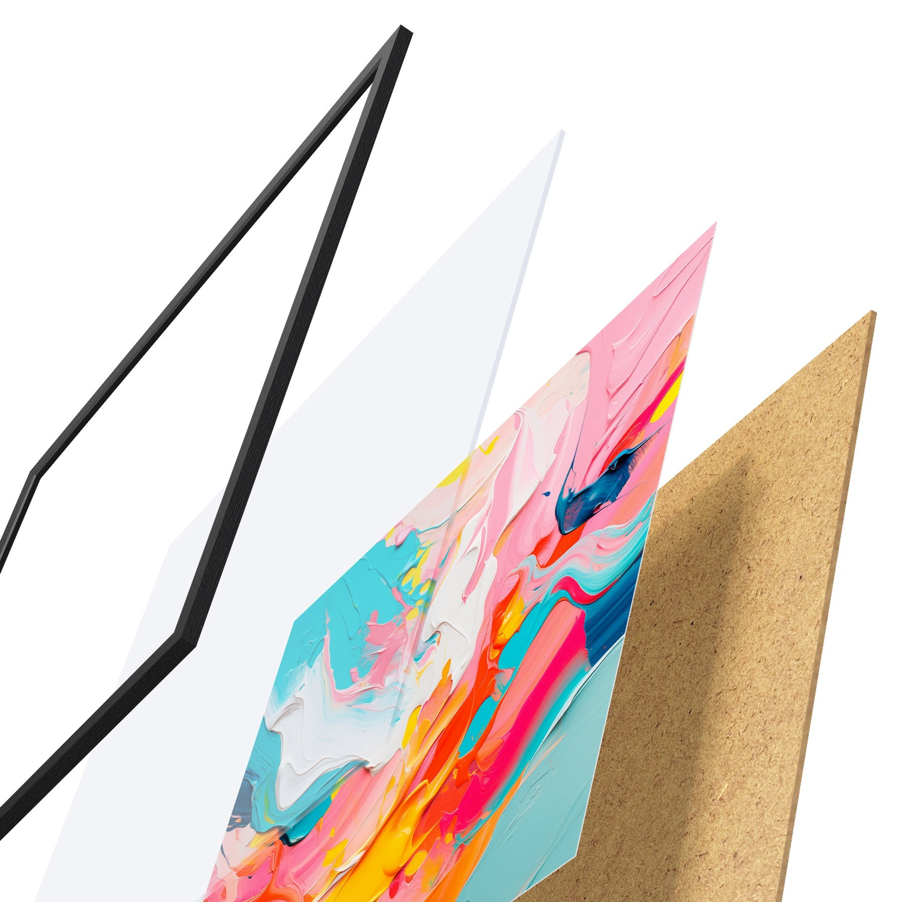 Das Poster besteht aus einem Rahmen, Plexiglas, einem gedruckten Bild und einer Rückwand aus Spanplatten. Dank der Halterungen auf der Rückseite kann das Poster sofort an die Wand gehängt werden.