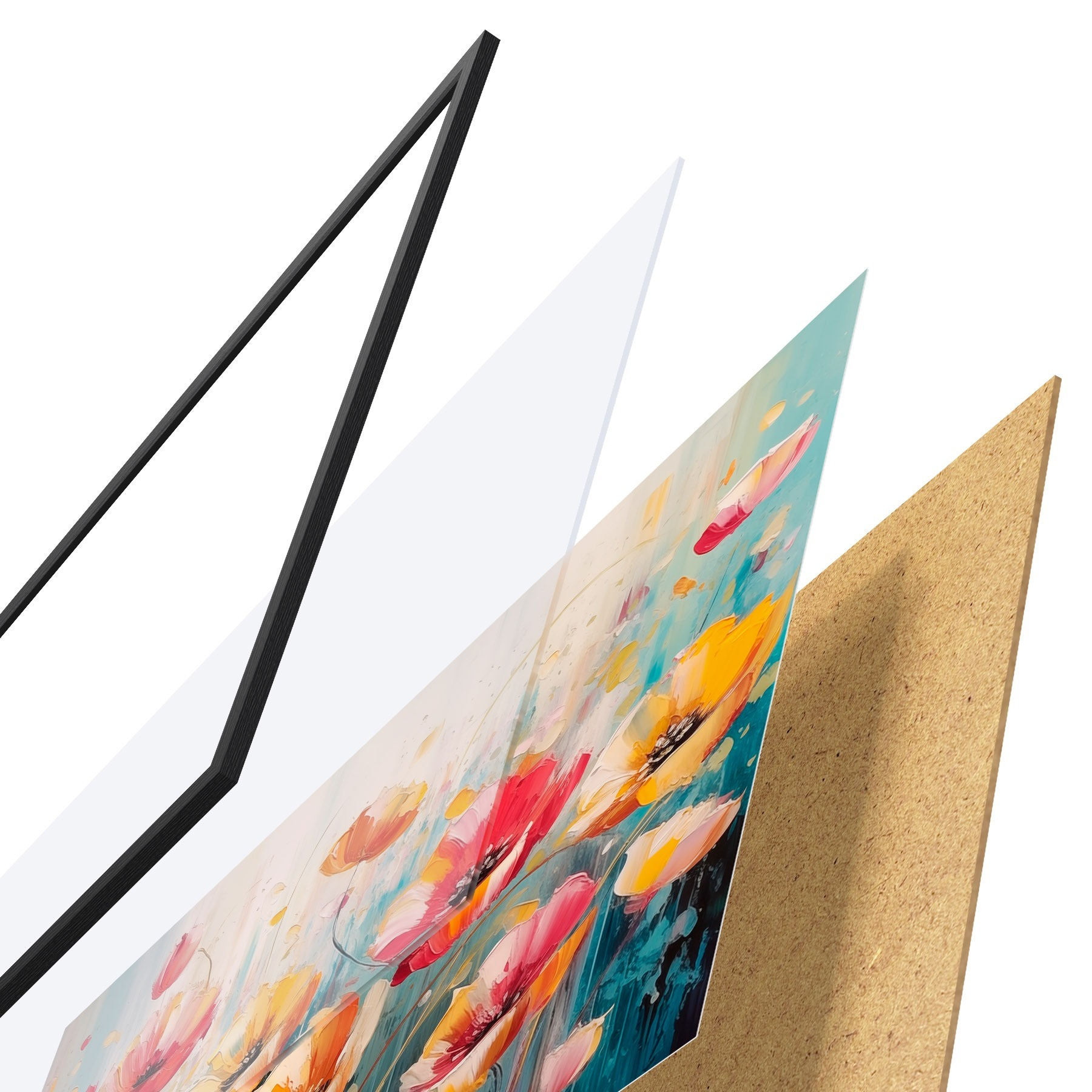 Das Poster besteht aus einem Rahmen, Plexiglas, einem gedruckten Bild und einer Rückwand aus Spanplatten. Dank der Halterungen auf der Rückseite kann das Poster sofort an die Wand gehängt werden.