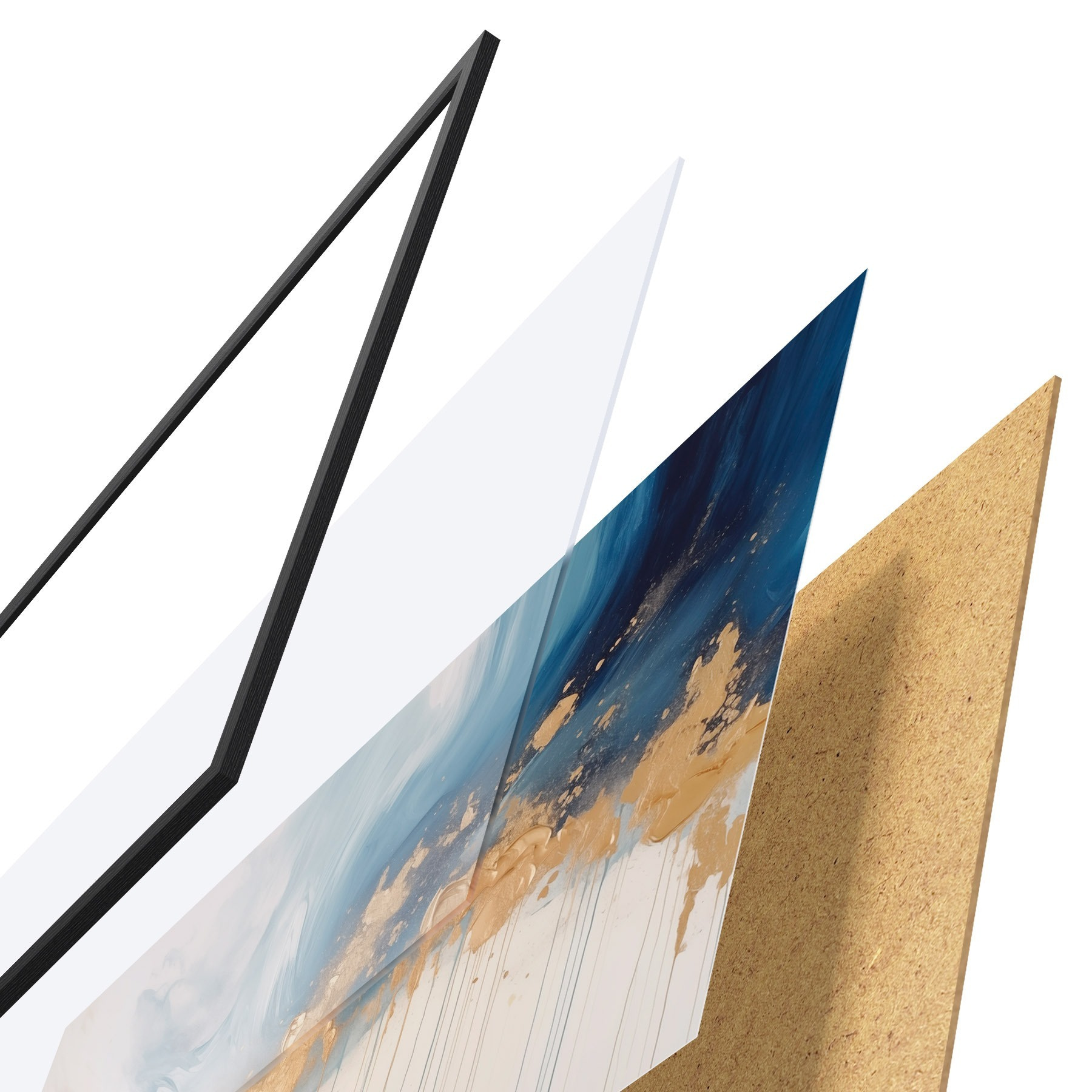 Das Poster besteht aus einem Rahmen, Plexiglas, einem gedruckten Bild und einer Rückwand aus Spanplatten. Dank der Halterungen auf der Rückseite kann das Poster sofort an die Wand gehängt werden.