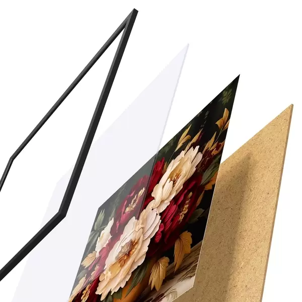 Das Poster besteht aus einem Rahmen, Plexiglas, einem gedruckten Bild und einer Rückwand aus Spanplatten. Dank der Halterungen auf der Rückseite kann das Poster sofort an die Wand gehängt werden.