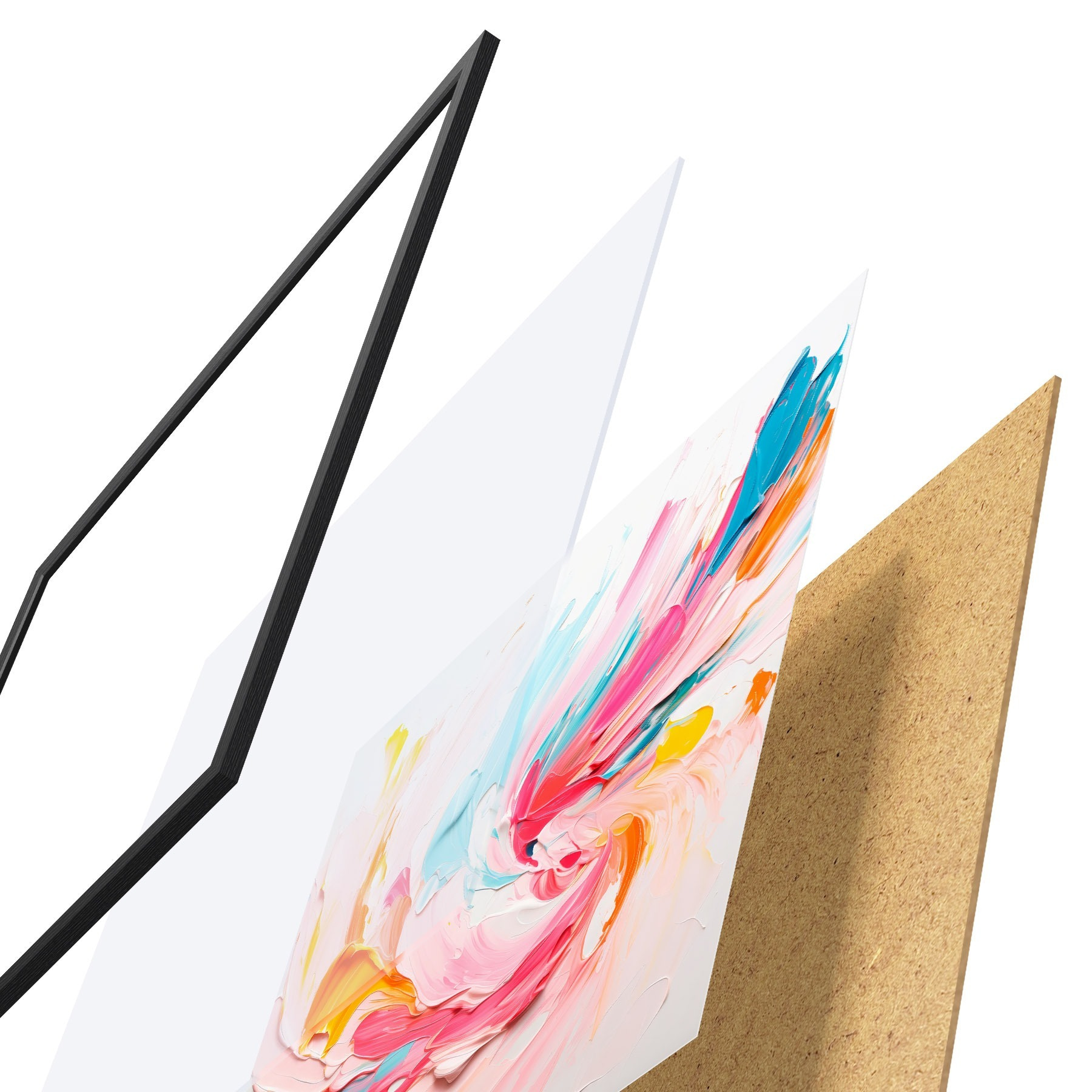 Das Poster besteht aus einem Rahmen, Plexiglas, einem gedruckten Bild und einer Rückwand aus Spanplatten. Dank der Halterungen auf der Rückseite kann das Poster sofort an die Wand gehängt werden.