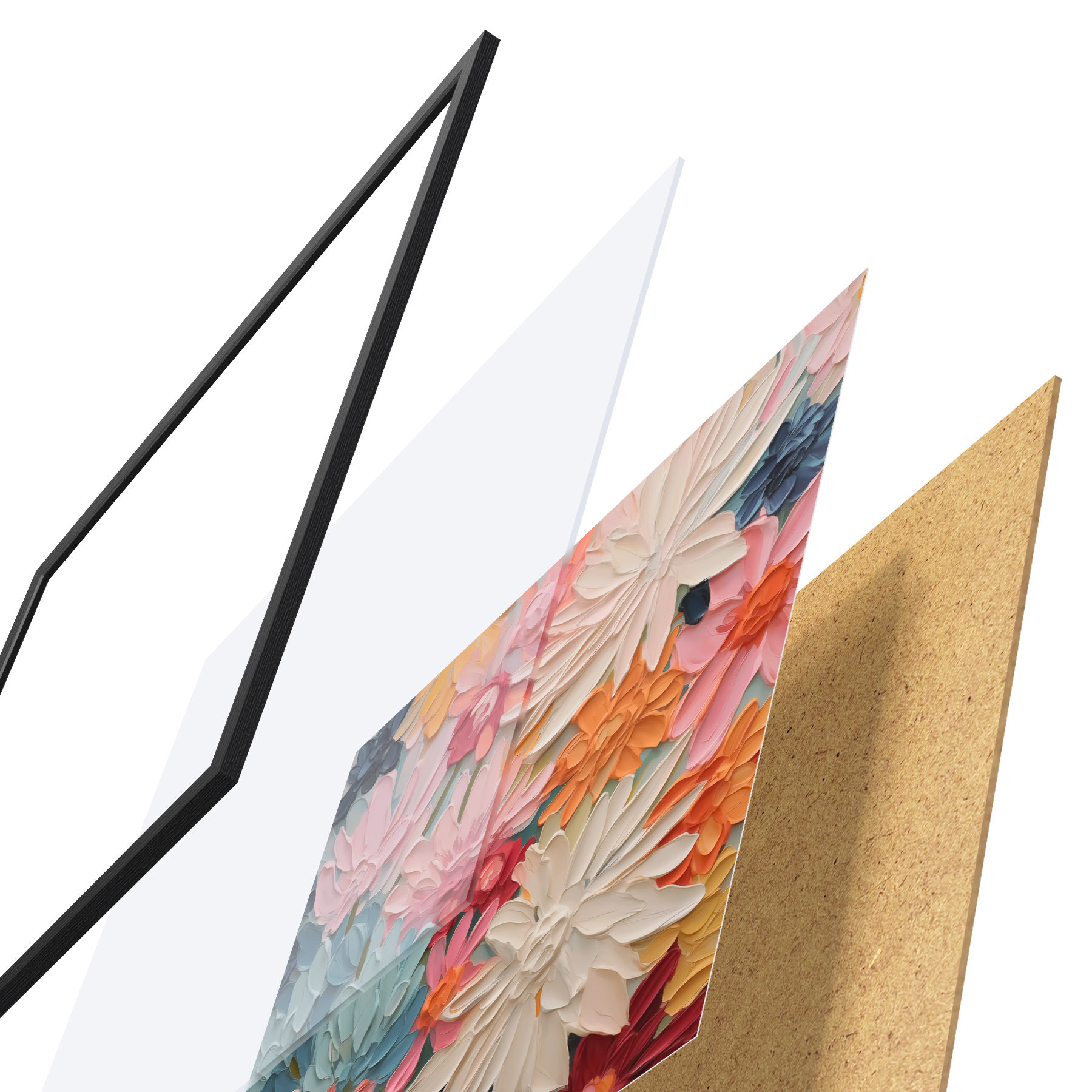 Das Poster besteht aus einem Rahmen, Plexiglas, einem gedruckten Bild und einer Rückwand aus Spanplatten. Dank der Halterungen auf der Rückseite kann das Poster sofort an die Wand gehängt werden.