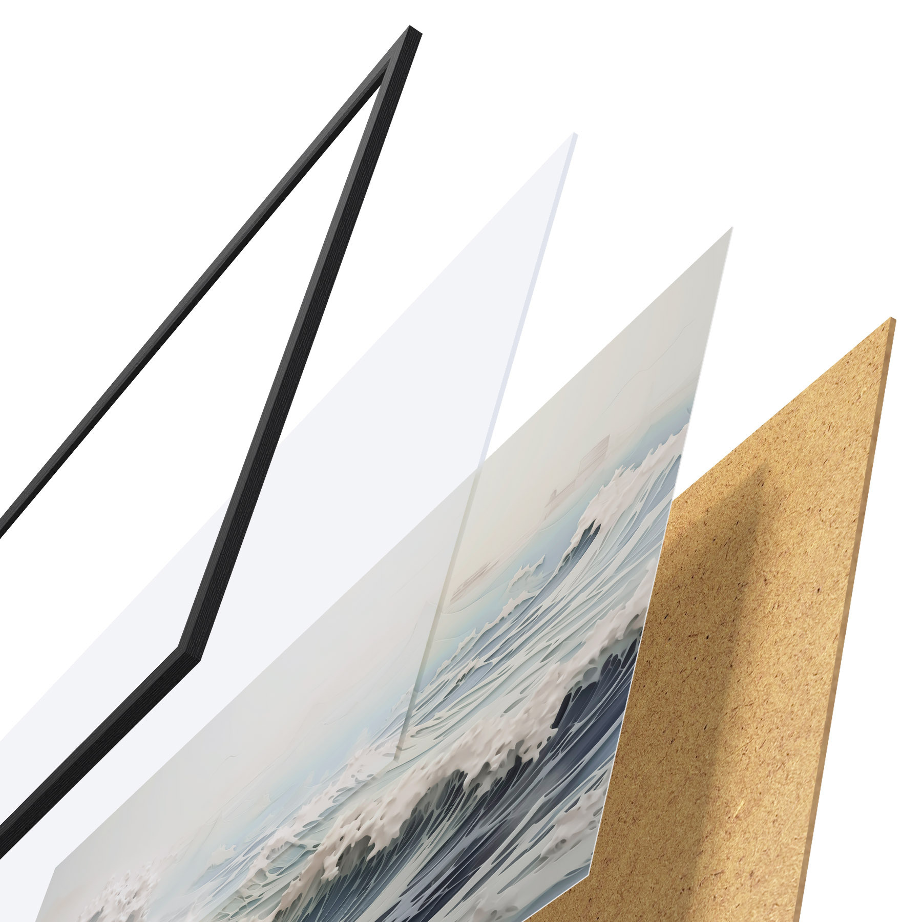 Das Poster besteht aus einem Rahmen, Plexiglas, einem gedruckten Bild und einer Rückwand aus Spanplatten. Dank der Halterungen auf der Rückseite kann das Poster sofort an die Wand gehängt werden.