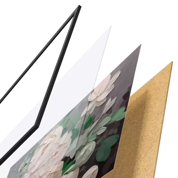 Das Poster besteht aus einem Rahmen, Plexiglas, einem gedruckten Bild und einer Rückwand aus Spanplatten. Dank der Halterungen auf der Rückseite kann das Poster sofort an die Wand gehängt werden.