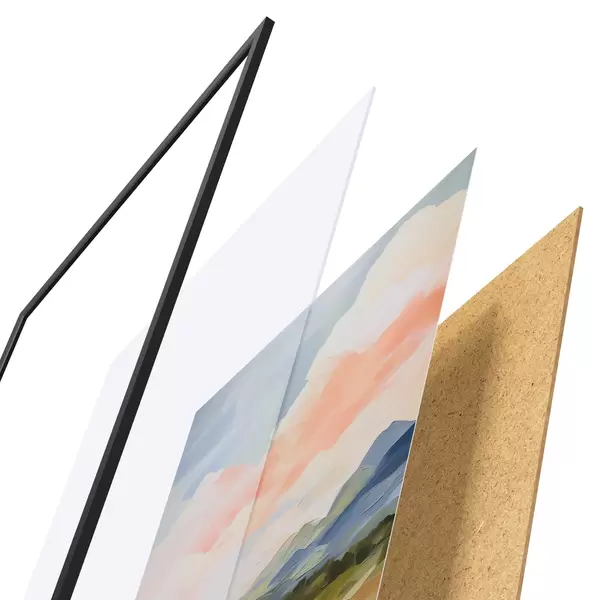 Das Poster besteht aus einem Rahmen, Plexiglas, einem gedruckten Bild und einer Rückwand aus Spanplatten. Dank der Halterungen auf der Rückseite kann das Poster sofort an die Wand gehängt werden.