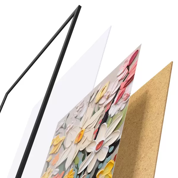 Das Poster besteht aus einem Rahmen, Plexiglas, einem gedruckten Bild und einer Rückwand aus Spanplatten. Dank der Halterungen auf der Rückseite kann das Poster sofort an die Wand gehängt werden.