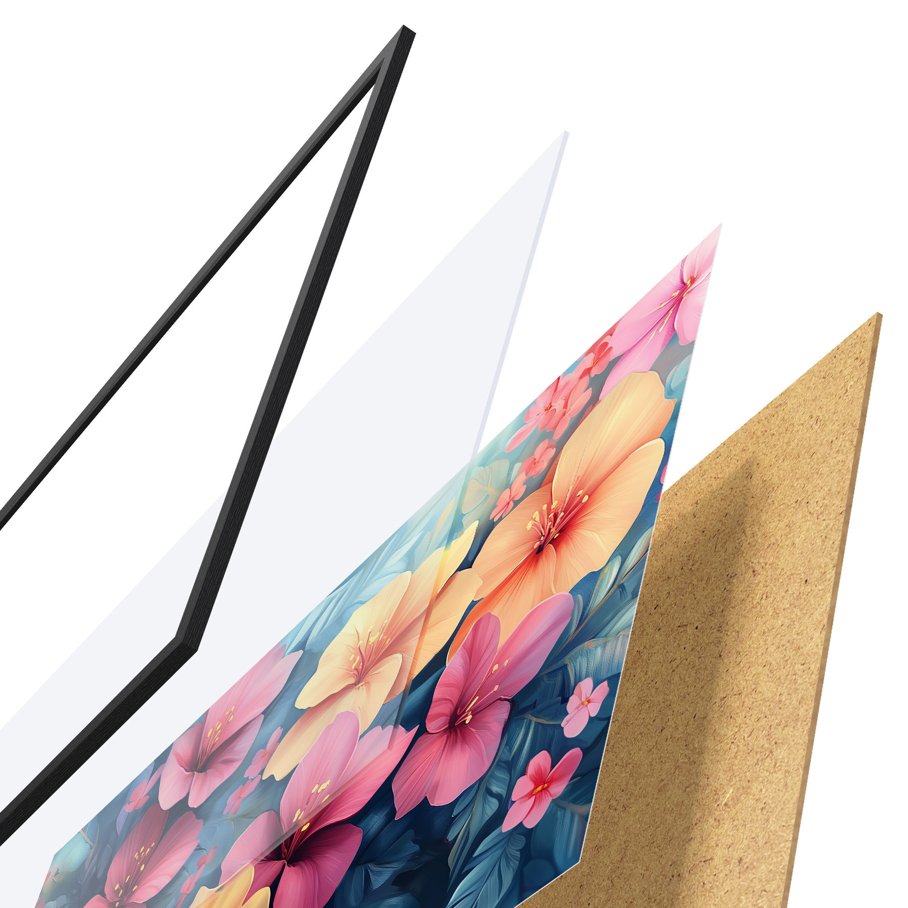 Das Poster besteht aus einem Rahmen, Plexiglas, einem gedruckten Bild und einer Rückwand aus Spanplatten. Dank der Halterungen auf der Rückseite kann das Poster sofort an die Wand gehängt werden.