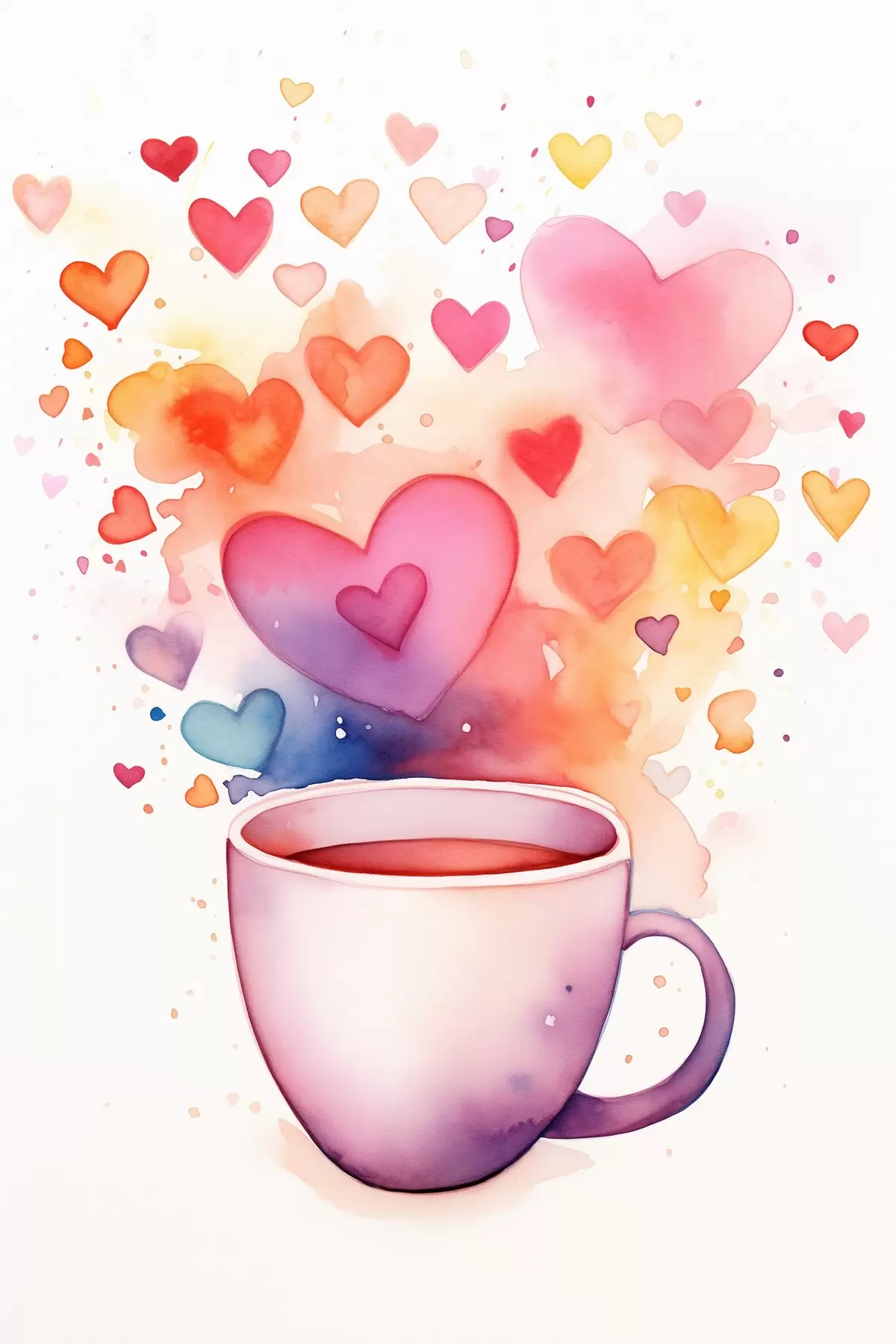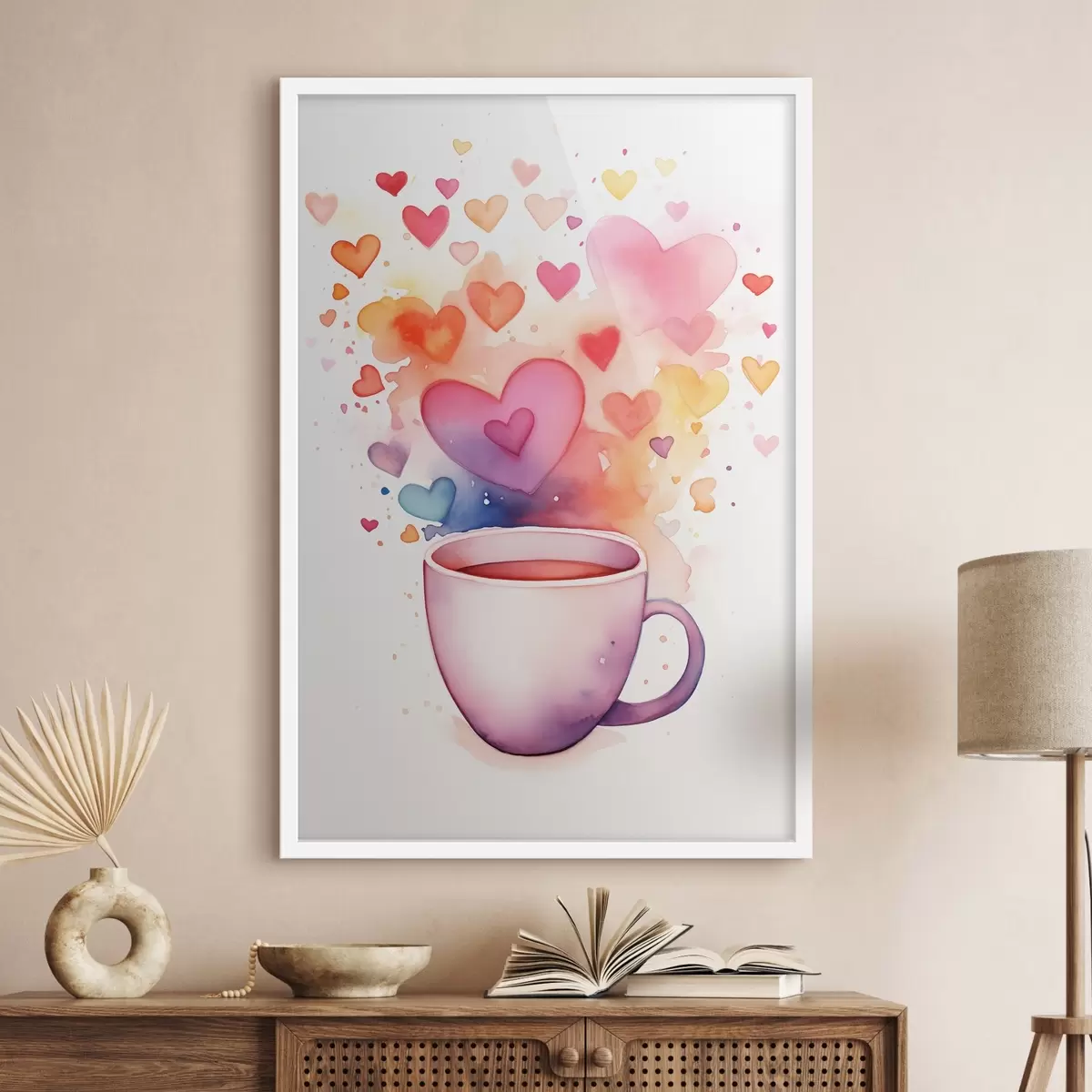 Poster Eine Tasse auf einem Hintergrund aus Aquarellherzen Nr f42869