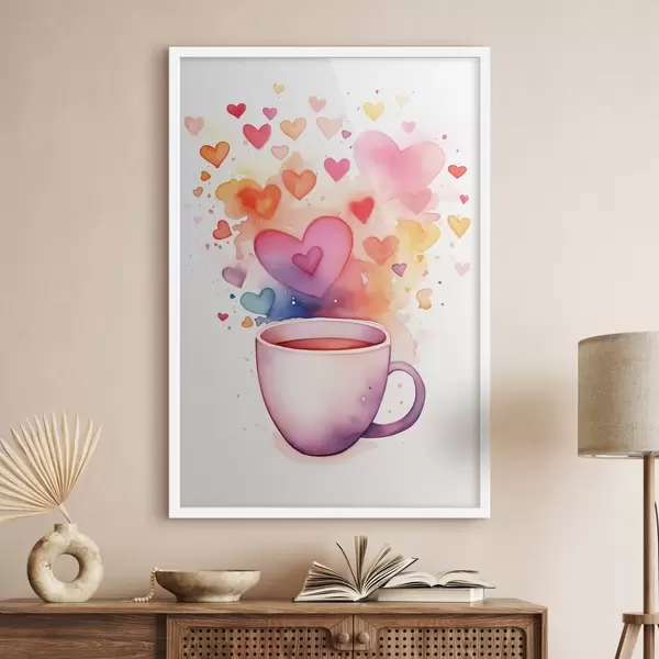 Poster Eine Tasse auf einem Hintergrund aus Aquarellherzen f42869