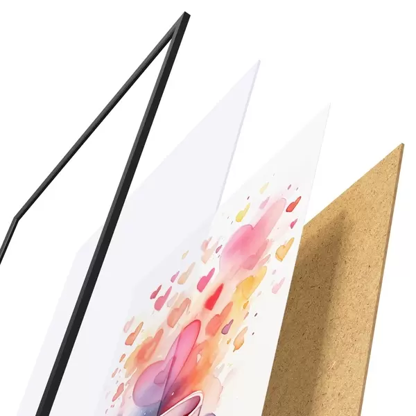 Das Poster besteht aus einem Rahmen, Plexiglas, einem gedruckten Bild und einer Rückwand aus Spanplatten. Dank der Halterungen auf der Rückseite kann das Poster sofort an die Wand gehängt werden.