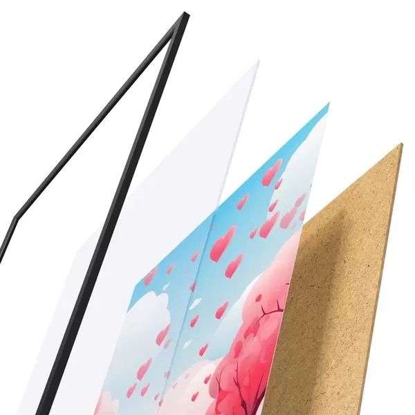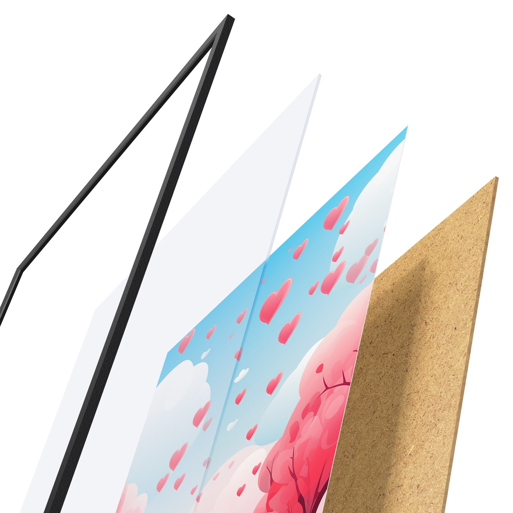Das Poster besteht aus einem Rahmen, Plexiglas, einem gedruckten Bild und einer Rückwand aus Spanplatten. Dank der Halterungen auf der Rückseite kann das Poster sofort an die Wand gehängt werden.