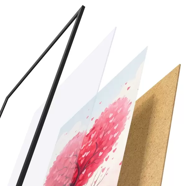 Das Poster besteht aus einem Rahmen, Plexiglas, einem gedruckten Bild und einer Rückwand aus Spanplatten. Dank der Halterungen auf der Rückseite kann das Poster sofort an die Wand gehängt werden.