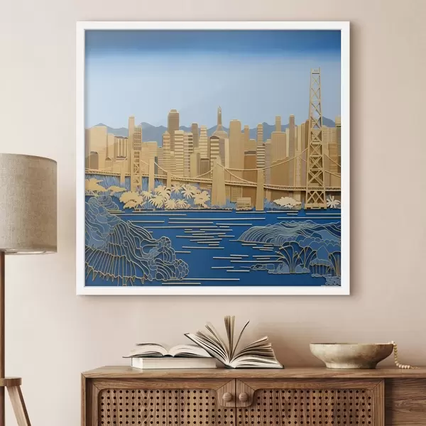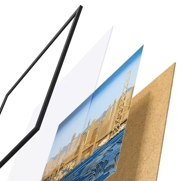 Das Poster besteht aus einem Rahmen, Plexiglas, einem gedruckten Bild und einer Rückwand aus Spanplatten. Dank der Halterungen auf der Rückseite kann das Poster sofort an die Wand gehängt werden.