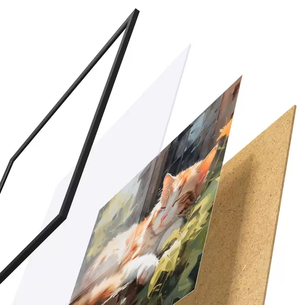 Das Poster besteht aus einem Rahmen, Plexiglas, einem gedruckten Bild und einer Rückwand aus Spanplatten. Dank der Halterungen auf der Rückseite kann das Poster sofort an die Wand gehängt werden.