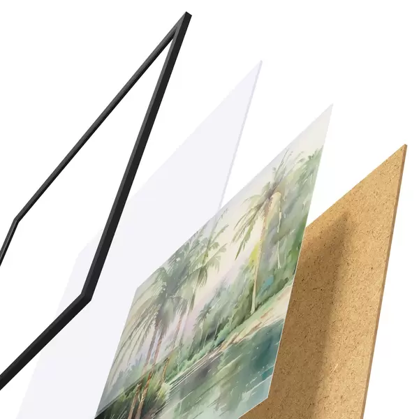Das Poster besteht aus einem Rahmen, Plexiglas, einem gedruckten Bild und einer Rückwand aus Spanplatten. Dank der Halterungen auf der Rückseite kann das Poster sofort an die Wand gehängt werden.