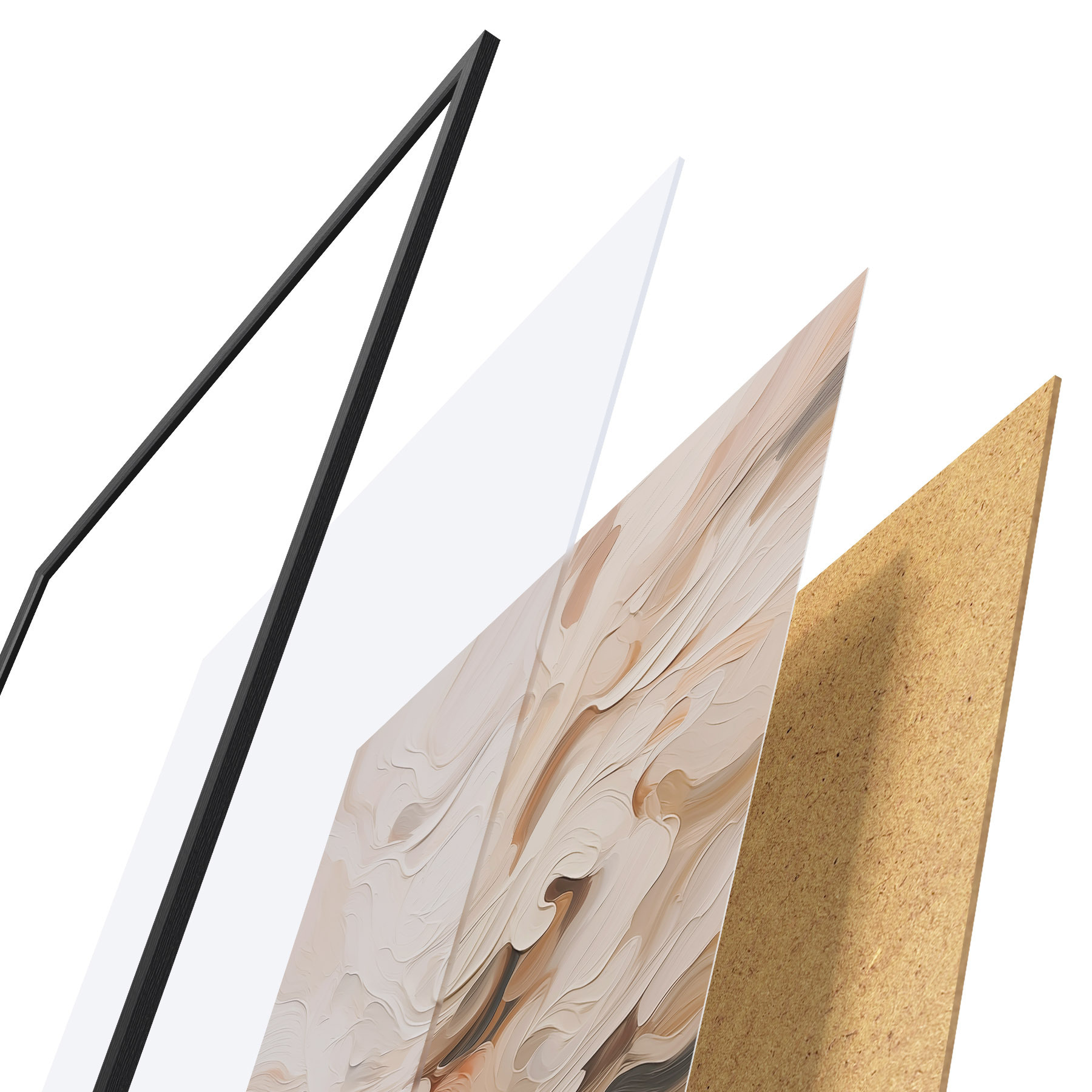 Das Poster besteht aus einem Rahmen, Plexiglas, einem gedruckten Bild und einer Rückwand aus Spanplatten. Dank der Halterungen auf der Rückseite kann das Poster sofort an die Wand gehängt werden.