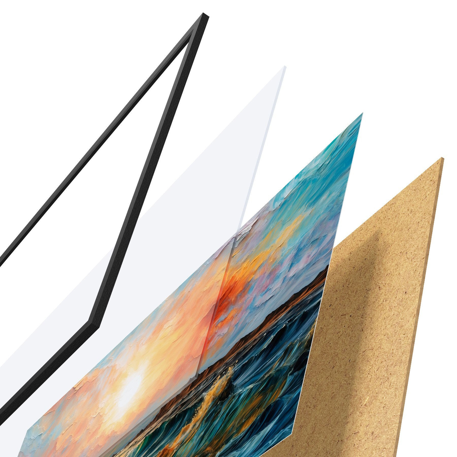 Das Poster besteht aus einem Rahmen, Plexiglas, einem gedruckten Bild und einer Rückwand aus Spanplatten. Dank der Halterungen auf der Rückseite kann das Poster sofort an die Wand gehängt werden.