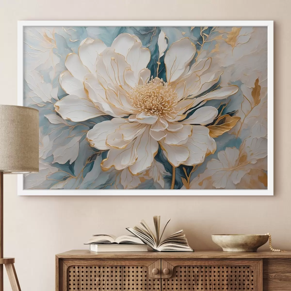 Poster Weiße Blume mit Konturen auf blau-weißem Hintergrund f42923