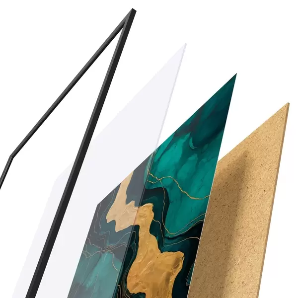 Das Poster besteht aus einem Rahmen, Plexiglas, einem gedruckten Bild und einer Rückwand aus Spanplatten. Dank der Halterungen auf der Rückseite kann das Poster sofort an die Wand gehängt werden.
