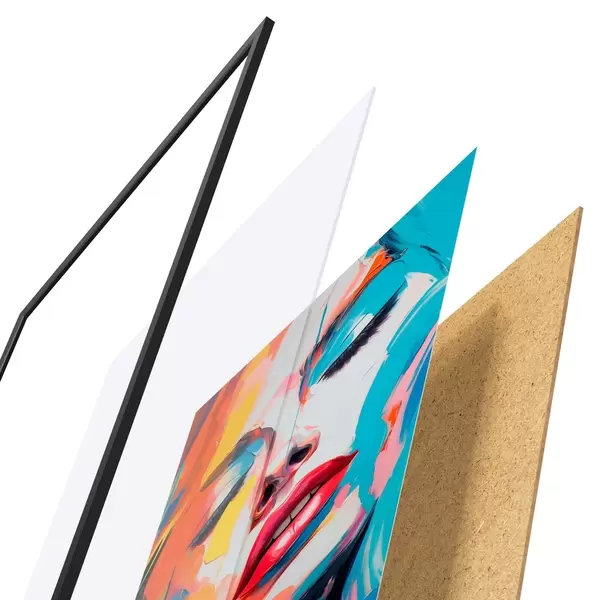Das Poster besteht aus einem Rahmen, Plexiglas, einem gedruckten Bild und einer Rückwand aus Spanplatten. Dank der Halterungen auf der Rückseite kann das Poster sofort an die Wand gehängt werden.
