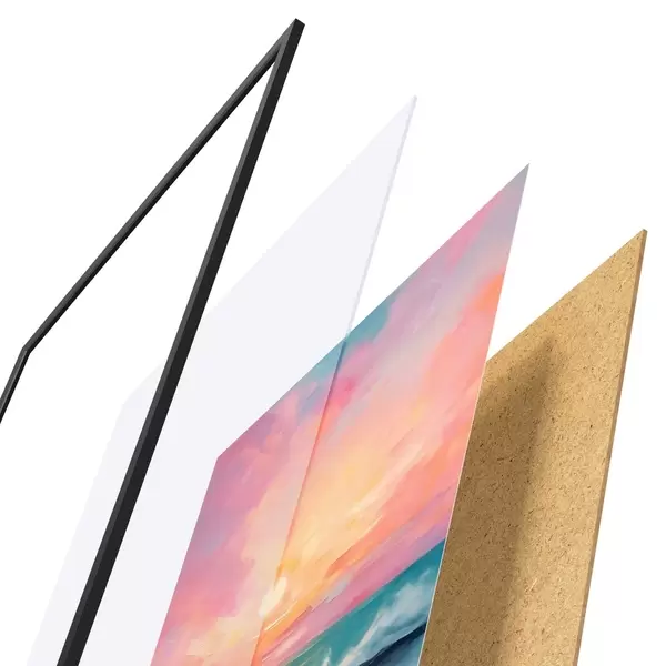 Das Poster besteht aus einem Rahmen, Plexiglas, einem gedruckten Bild und einer Rückwand aus Spanplatten. Dank der Halterungen auf der Rückseite kann das Poster sofort an die Wand gehängt werden.
