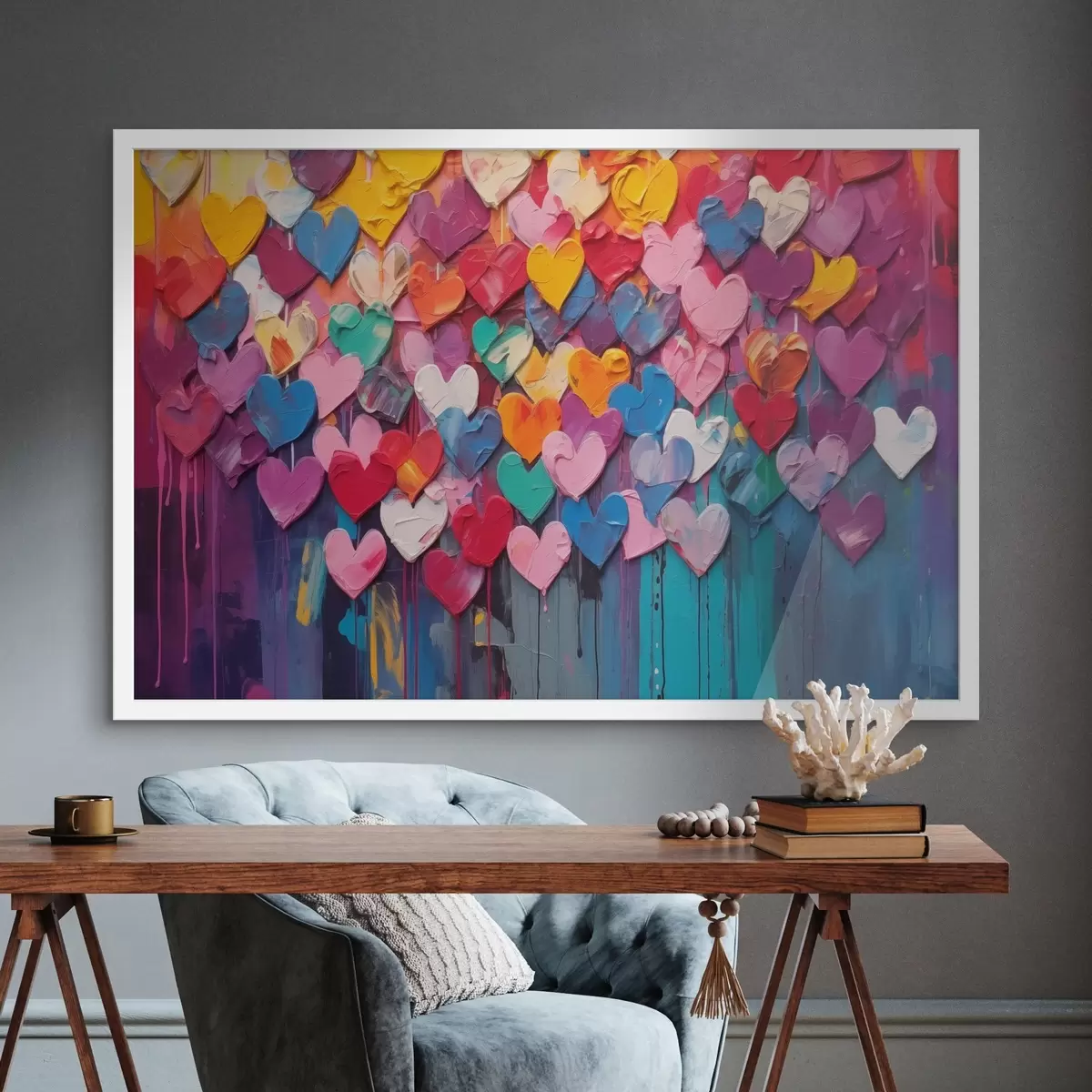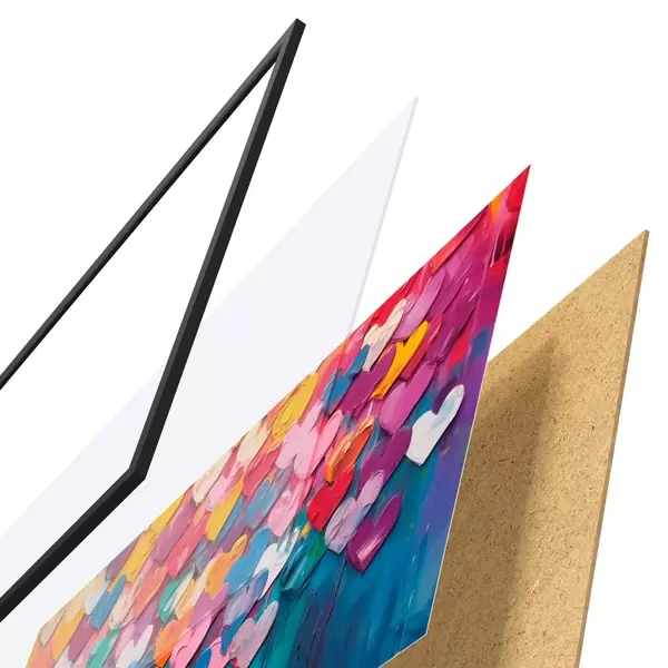 Das Poster besteht aus einem Rahmen, Plexiglas, einem gedruckten Bild und einer Rückwand aus Spanplatten. Dank der Halterungen auf der Rückseite kann das Poster sofort an die Wand gehängt werden.