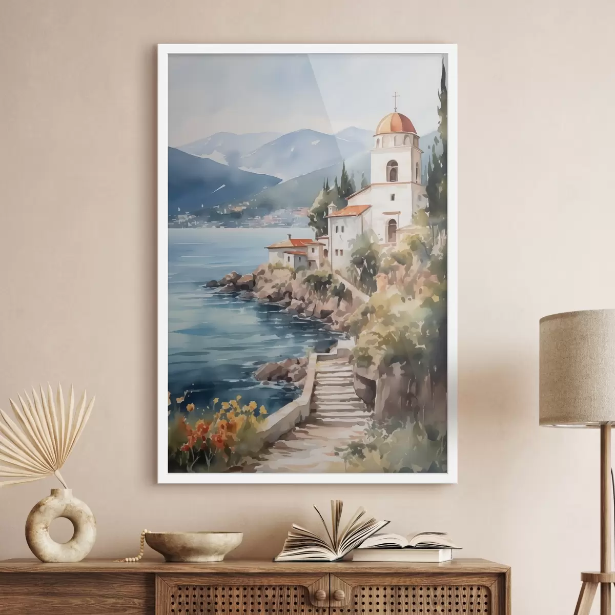 Poster Kirche am Meer mit Bergen im Hintergrund Nr f42962