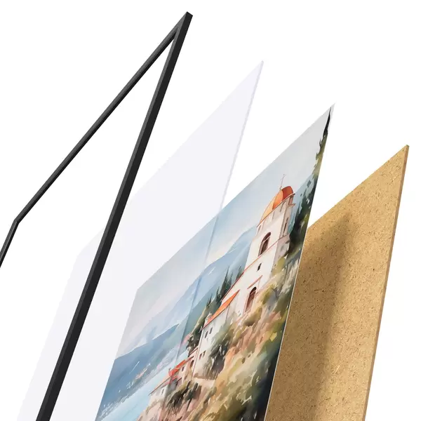 Das Poster besteht aus einem Rahmen, Plexiglas, einem gedruckten Bild und einer Rückwand aus Spanplatten. Dank der Halterungen auf der Rückseite kann das Poster sofort an die Wand gehängt werden.