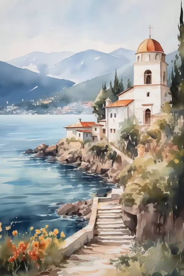 Poster Kirche am Meer mit Bergen im Hintergrund Nr f42962
