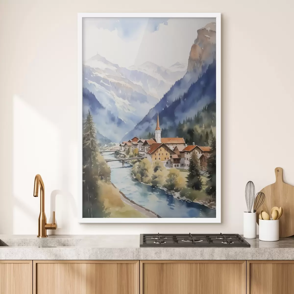 Poster Dorf in der Nähe der Berge Nachahmung Aquarell Nr f42964