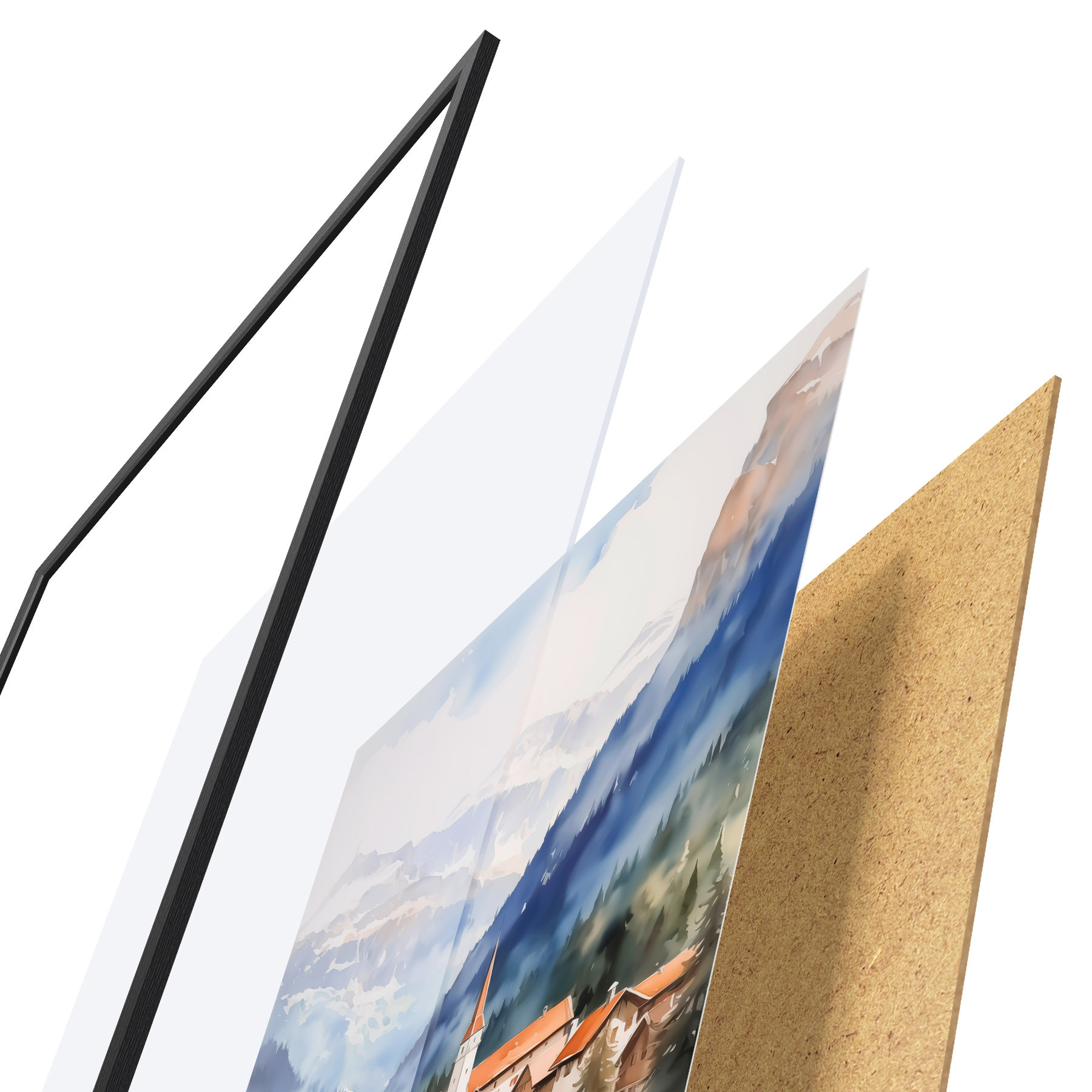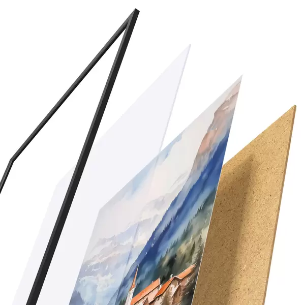 Das Poster besteht aus einem Rahmen, Plexiglas, einem gedruckten Bild und einer Rückwand aus Spanplatten. Dank der Halterungen auf der Rückseite kann das Poster sofort an die Wand gehängt werden.
