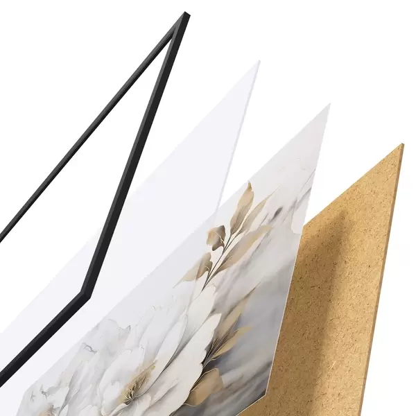 Das Poster besteht aus einem Rahmen, Plexiglas, einem gedruckten Bild und einer Rückwand aus Spanplatten. Dank der Halterungen auf der Rückseite kann das Poster sofort an die Wand gehängt werden.